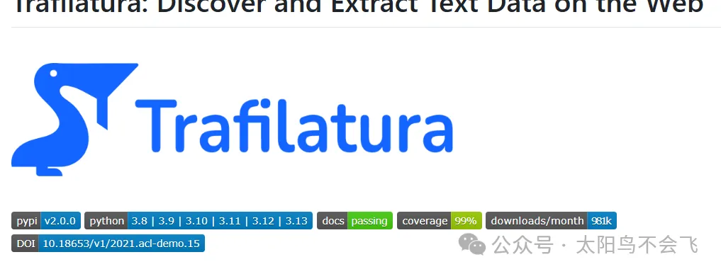 2025-04-19大家好,我是太阳鸟!今天给大家推荐一款强大的开源工具——Trafilatura,它是一个高效的Python库和命令行工具,专门用于从网页中提取结构化文本内容。无论是爬虫开发、数据分析,还是学术研究,Trafilatura 都能帮你快速获取干净的文本数据,避免冗余标签和广告干扰。